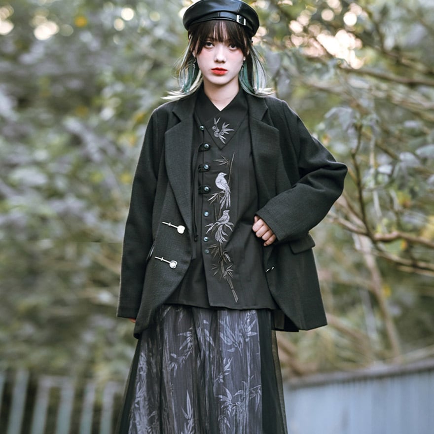 SEASONZ 古怪舎 中華風 チャイナ服 長袖シャツ ブラウス 刺繍 鳥 バンブー アシンメトリー エレガント 普段着使い