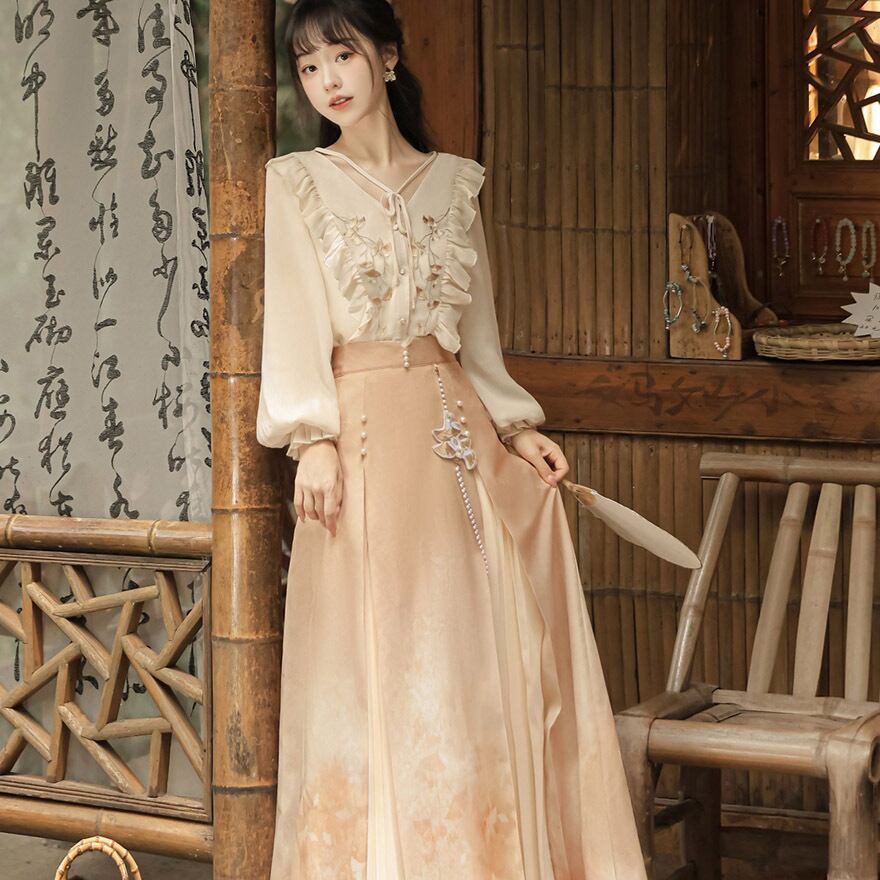 SEASONZ クラロリ セットアップ 長袖シャツ ブラウス ロングスカート エレガント チャイナドレス きれいめ 上品 レトロ ダークファッション 原宿スタイル