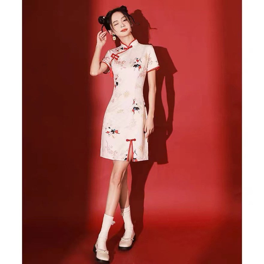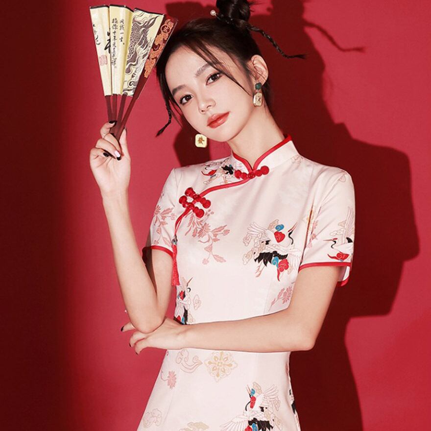 鶴の柄がお洒落なピンクのチャイナドレスです。
