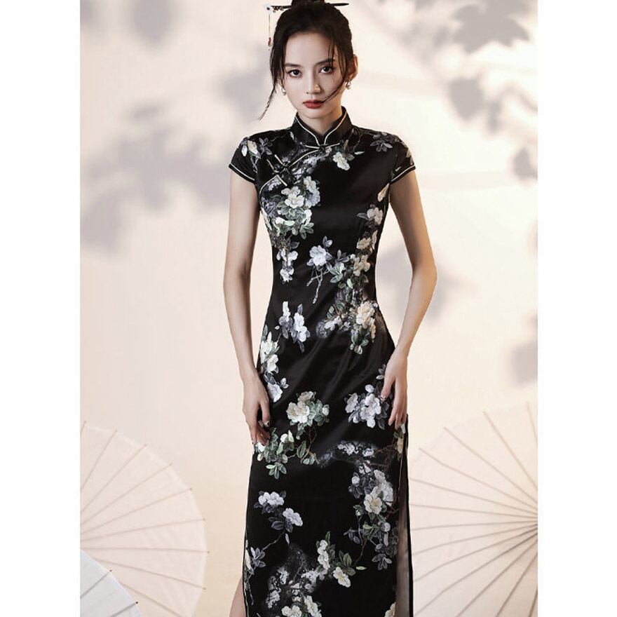 SEASONZ 地雷系 地雷女子 チャイナドレス スリット レトロ 花柄 エレガント ロング丈 ダークファッション 原宿スタイル