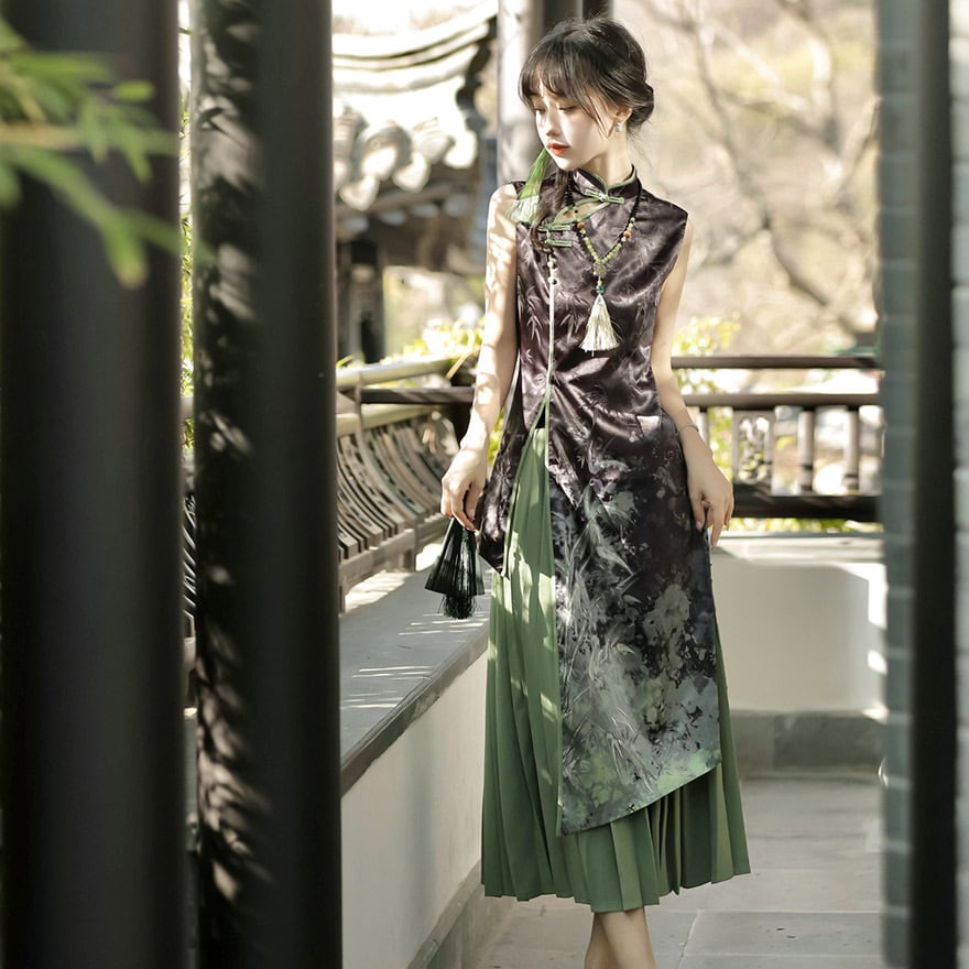 SEASONZ 華ロリ セットアップ トップス ノースリーブ ロングスカート プリーツスカート レトロ チャイナドレス 量産型