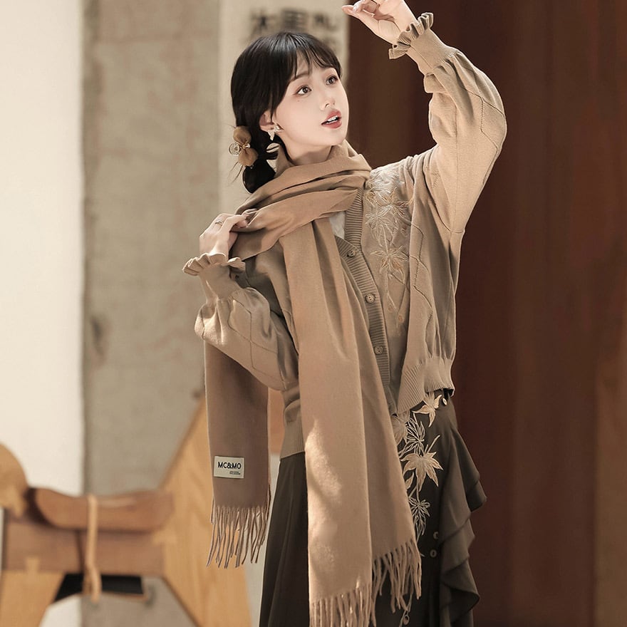 紅葉柄の刺繍が可愛いカーディガンと、シャツ、スカートの3点セットです。