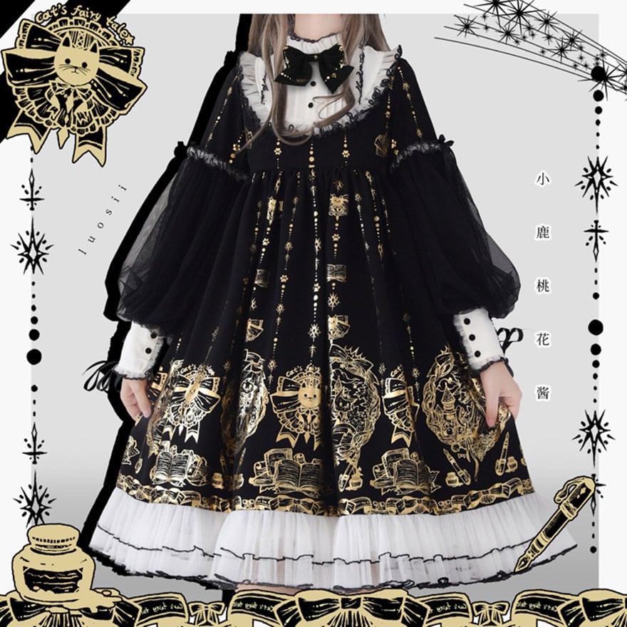 SEASONZ 納期45日 ゴスロリ ジャンパースカート ジャンスカ ワンピース ゴールドプリント ケーキスカート エレガント レトロ ダークゴシック