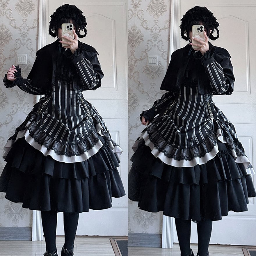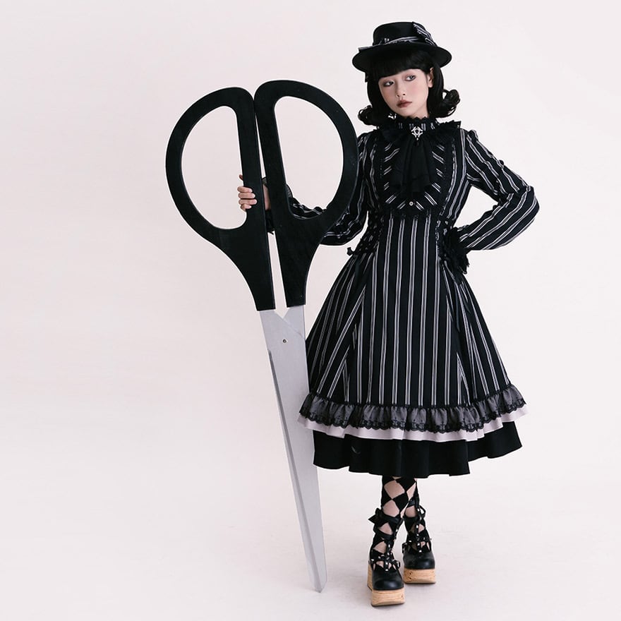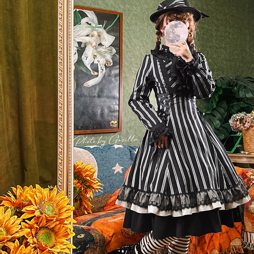 SEASONZ ゴスロリ ワンピース ドレス 長袖 ストライプ ヘリンボーン レトロ スタンドカラー エレガント ダークゴシック 病みかわいい