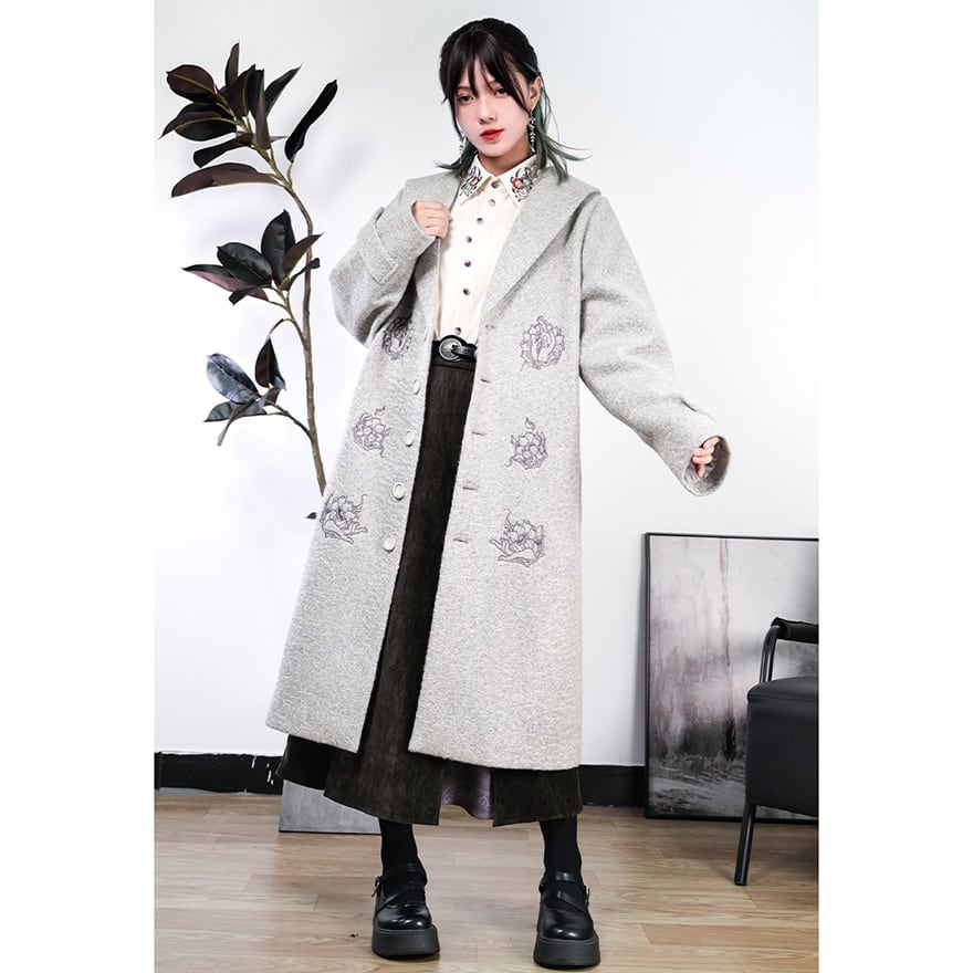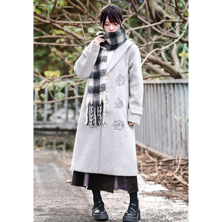 SEASONZ 古怪舎 チャイナ風 コート ロング丈 アウター 羽織り ウール 刺繍 大人かわいい エレガント 普段着使い 大人増し ダークファッション