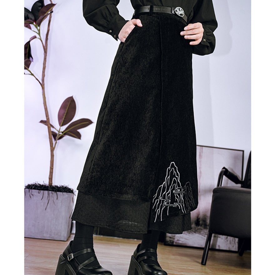 SEASONZ 古怪舎 スカート チャイナ風 ロングスカート ダブル 重ね着 刺繍 レトロ レイヤード 大人かわいい エレガント 普段着使い 大人増し ダークファッション