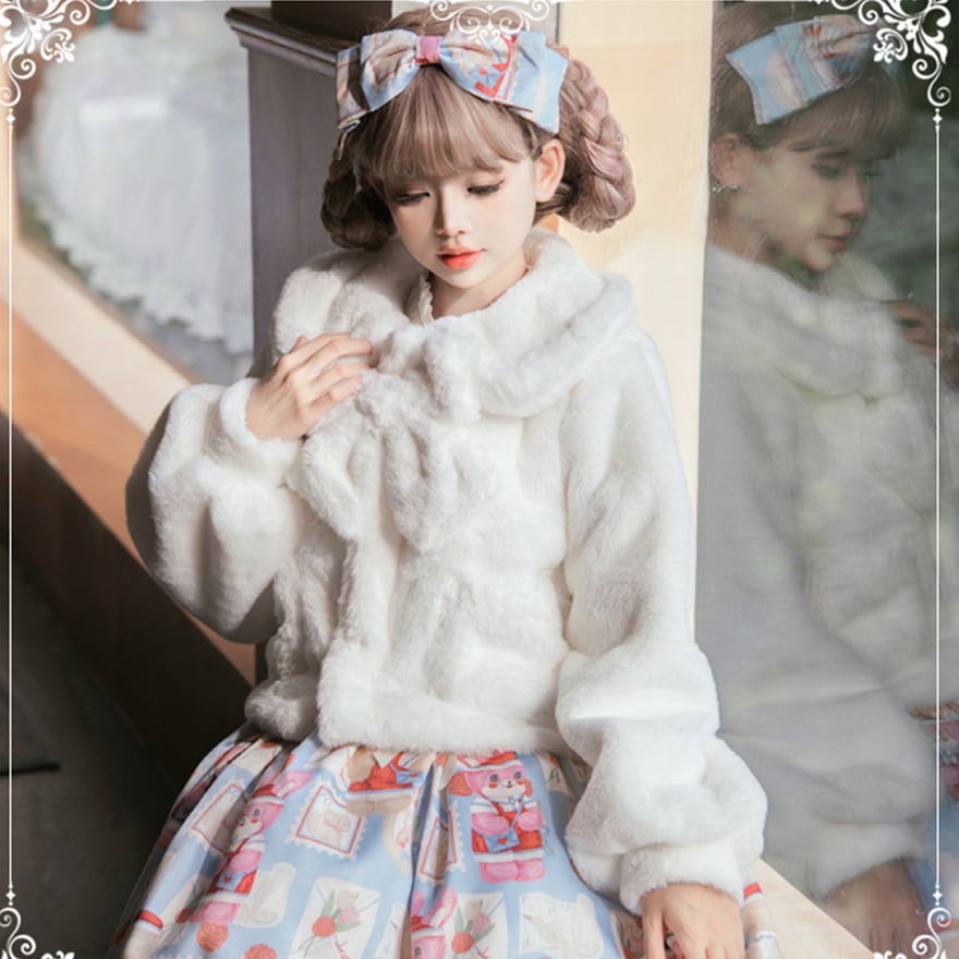 リボン襟のデザインがとても可愛いフェイクラビットファーケープです。
