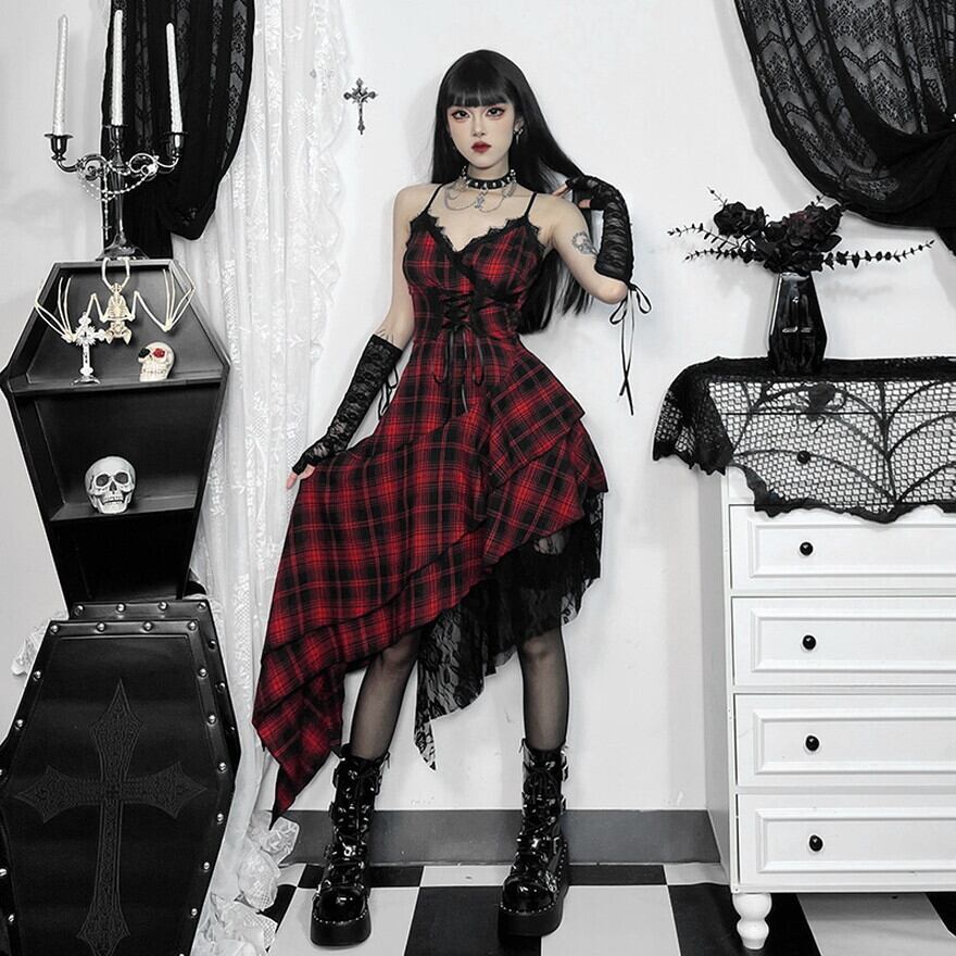 SEASONZ 地雷服 ワンピース アシンメトリー チェック柄 パンク 地雷女子 ストリートファッション ゴシック パンク