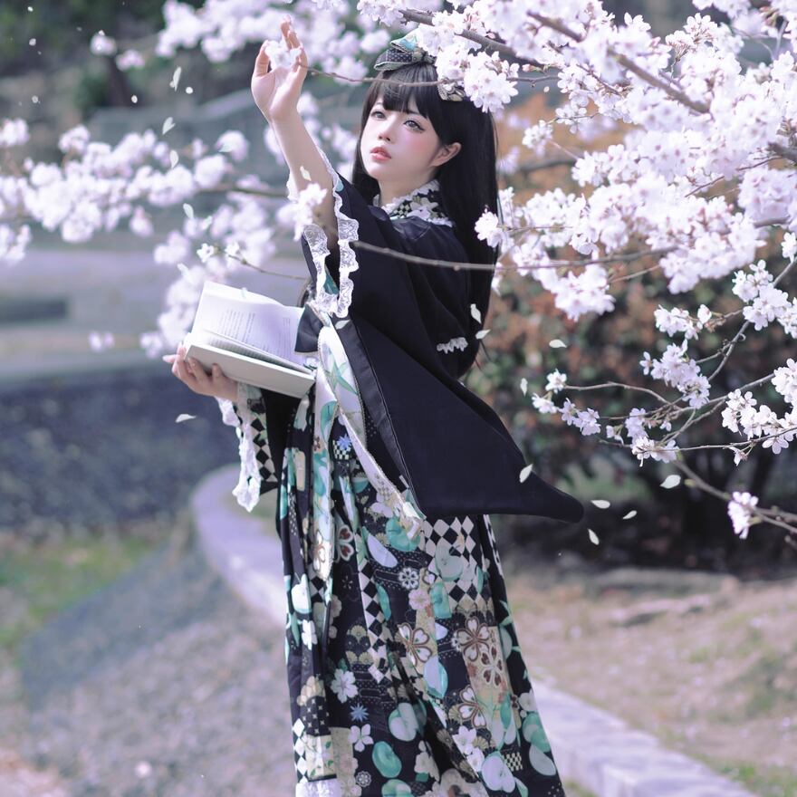 SEASONZ ファッション 和風ロリータ 和ロリ 着物 振袖 柄物 和装 2点 フルセット バーガンディ ジャンパースカート リボン カチューシャ 花柄 大正浪漫 大人きれいめ ゴシック