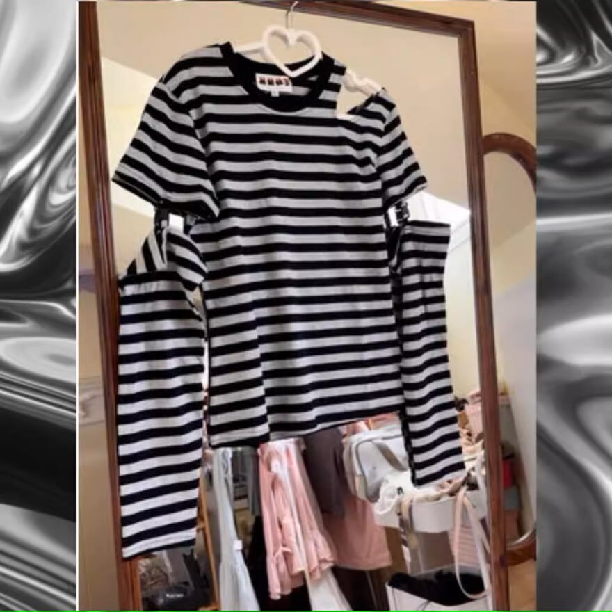 写真のボーダーシャツとの重ね着がおしゃれなノーズリーブです。