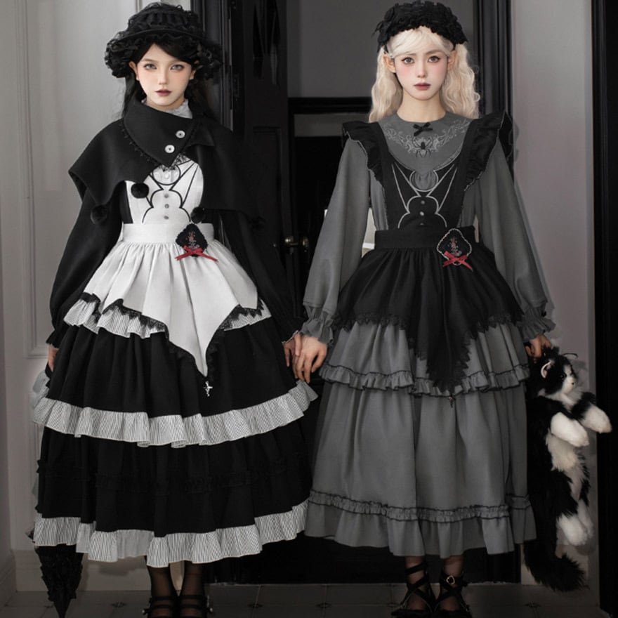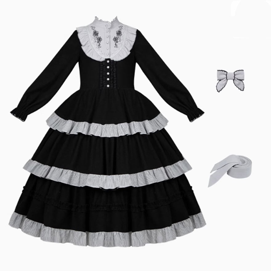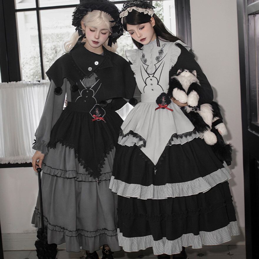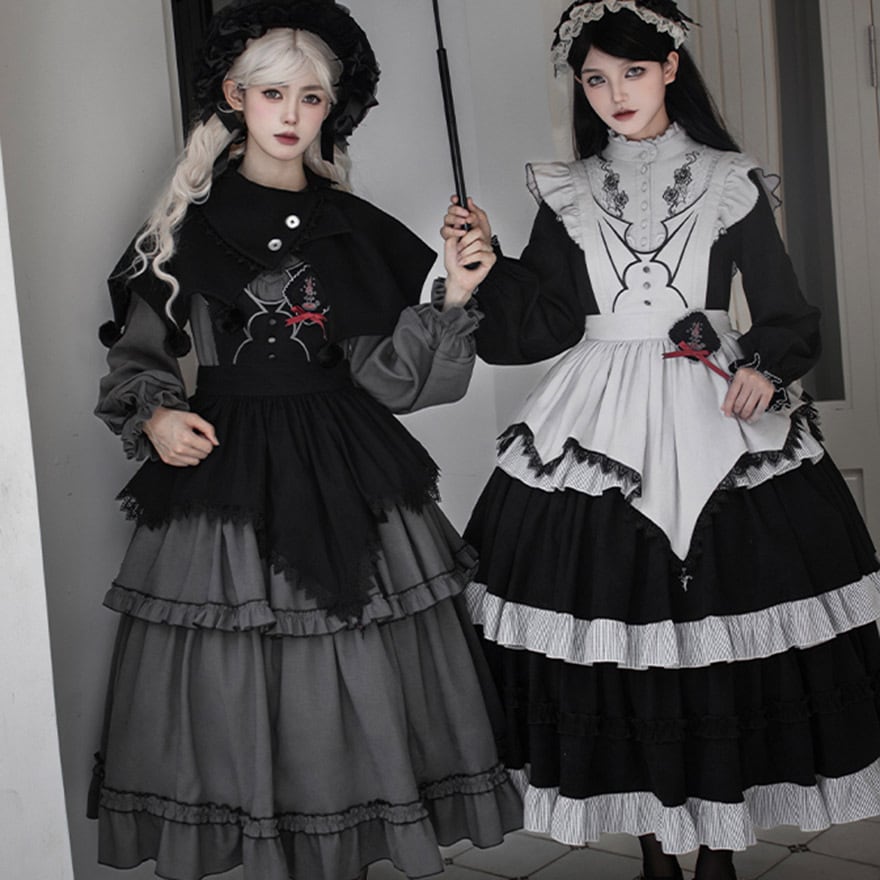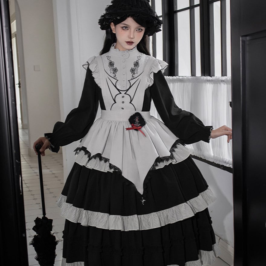 SEASONZ クラシカルメイド服 ワンピース 長袖 フリル スタンドネック PUJI 黒薔薇 刺繍 メイドワンピ エプロン メイドカフェ コンカフェ