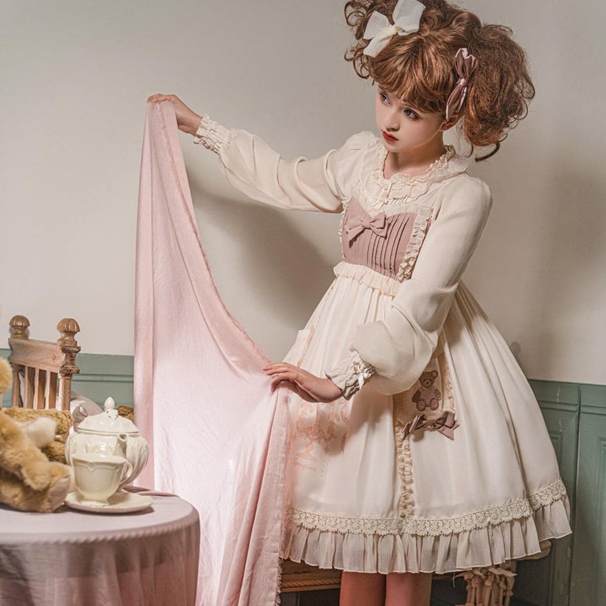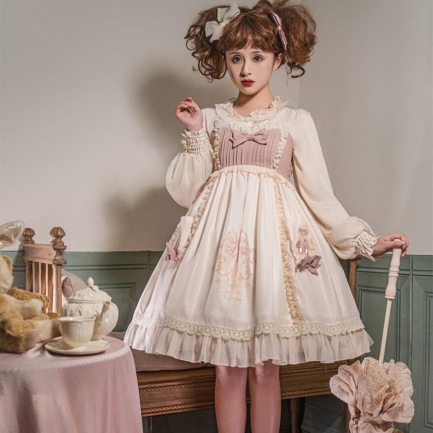 SEASONZ 甘ロリ ジャンパースカート Aライン リボン アンティーク風 フリル襟 くまちゃん 量産型 ガーリー ガーリー lolita