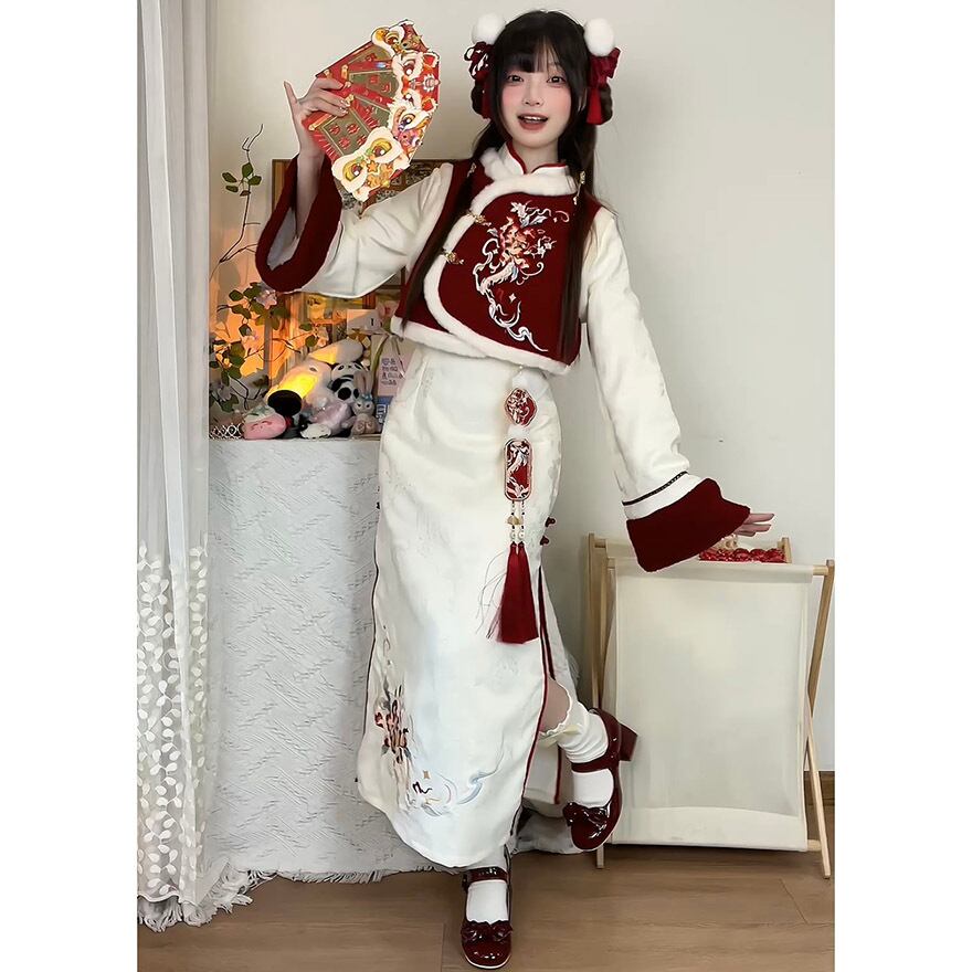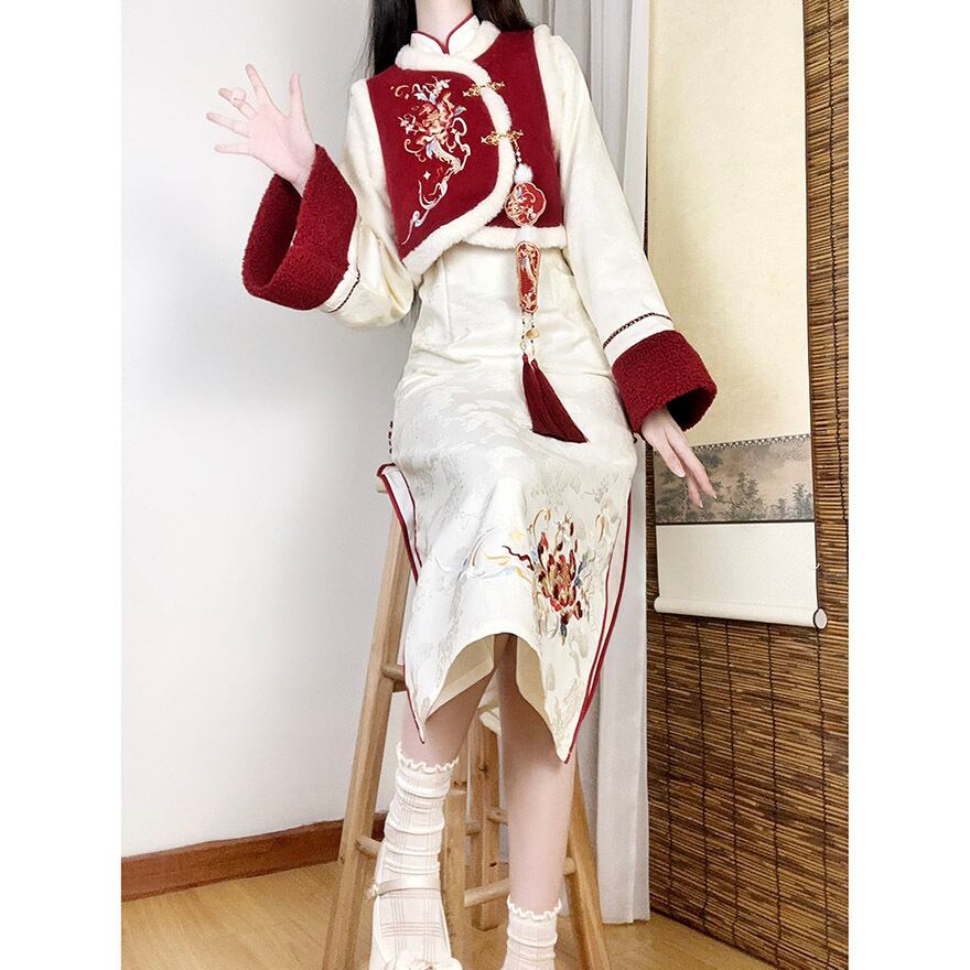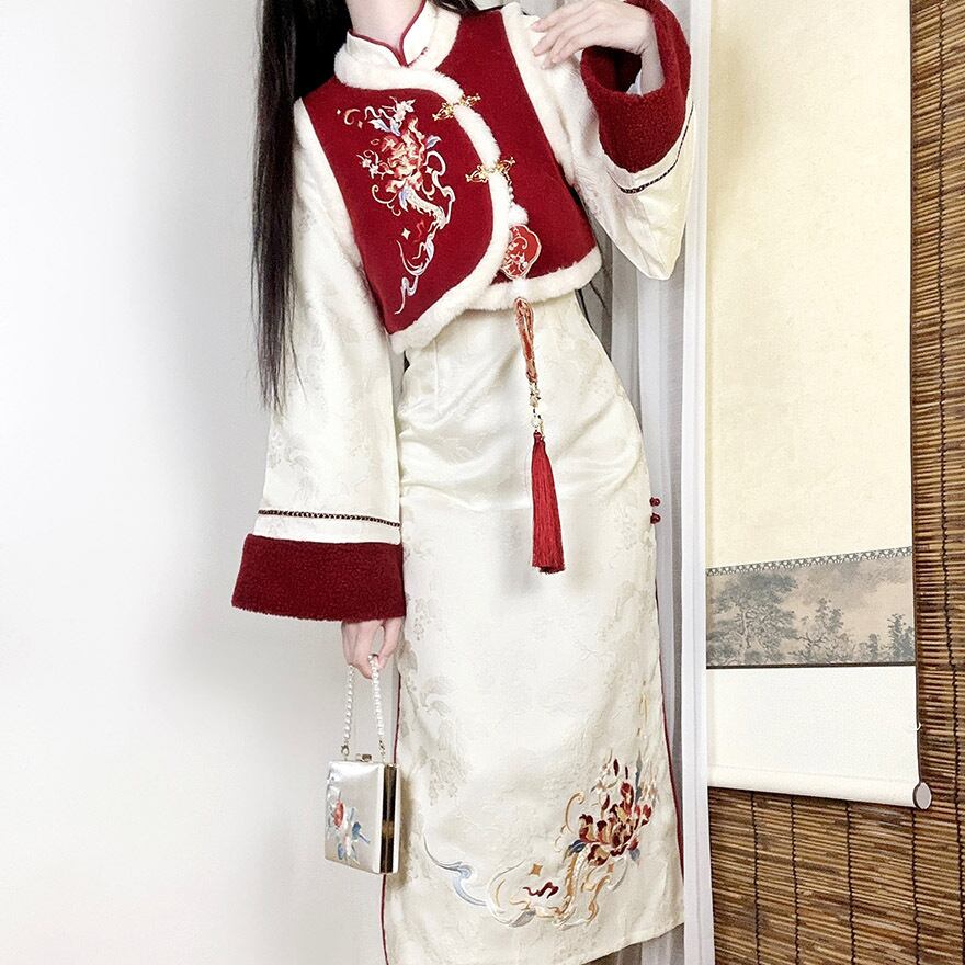 冬にぴったりのチャイナドレスとベストの2点セットです。