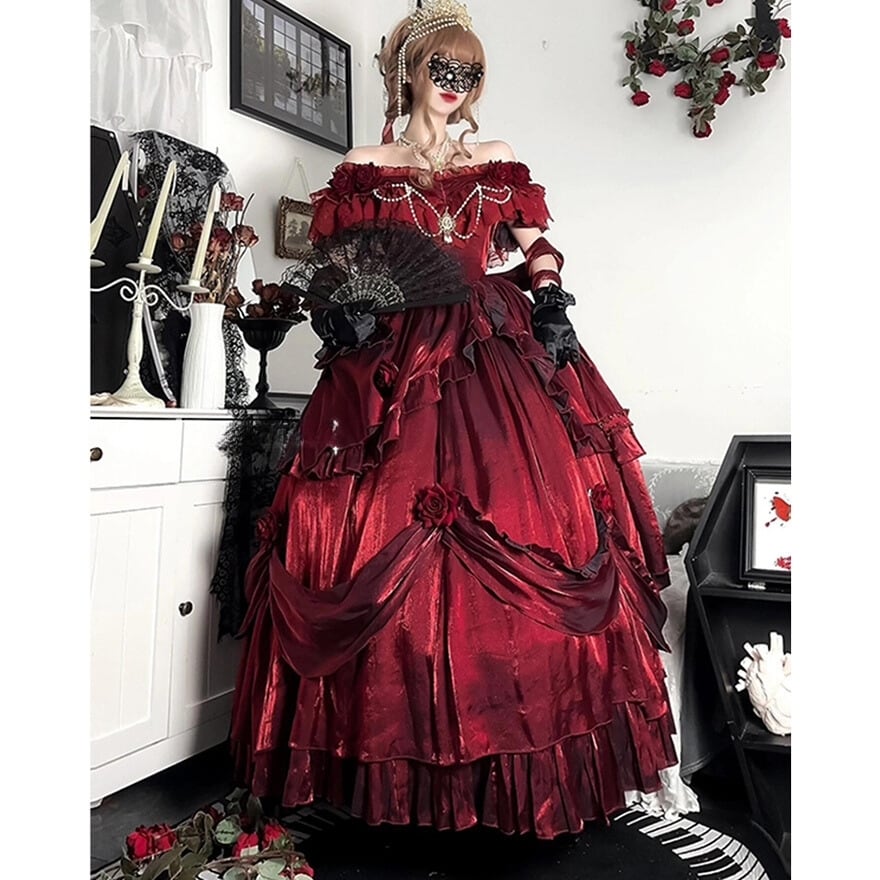 SEASONZ イベント パーティドレス ワンピース ロング丈 豪華 エレガント 姫袖 長袖 薔薇 オフショルダー おしゃれ増し コンカフェ衣装 ガーリー lolita