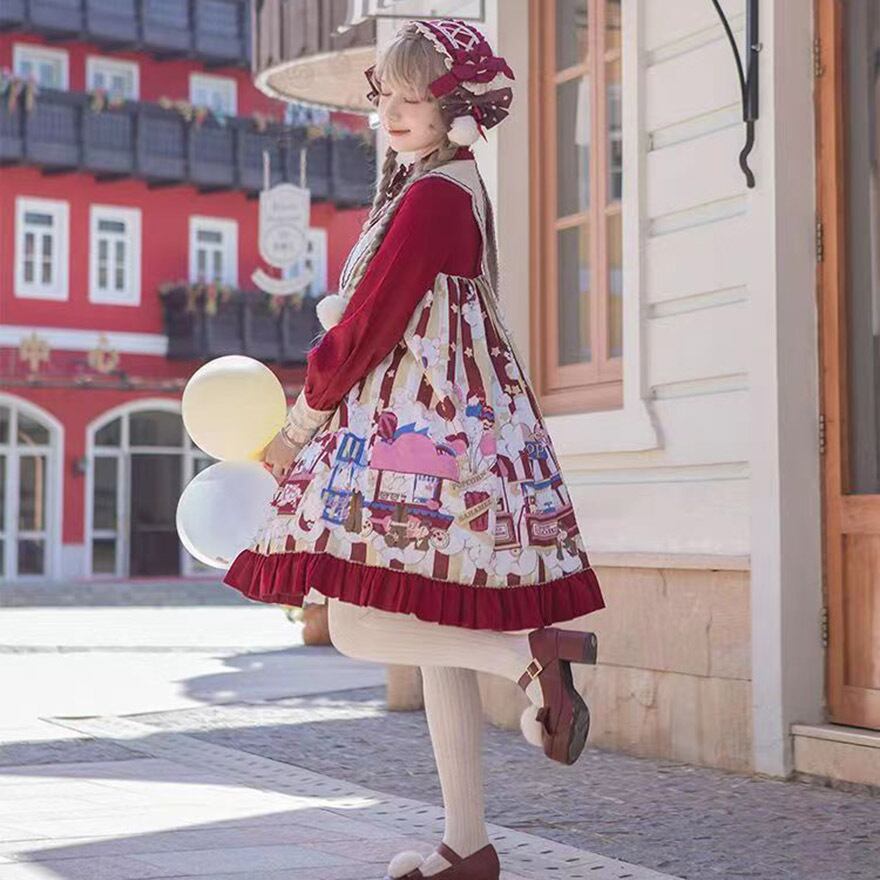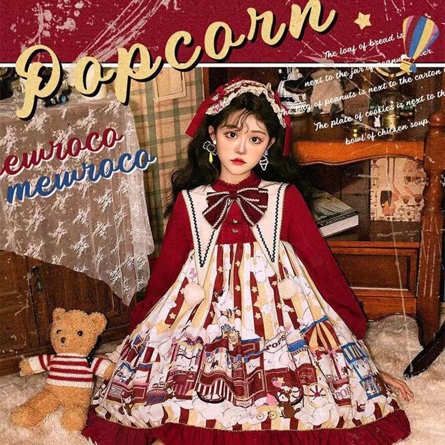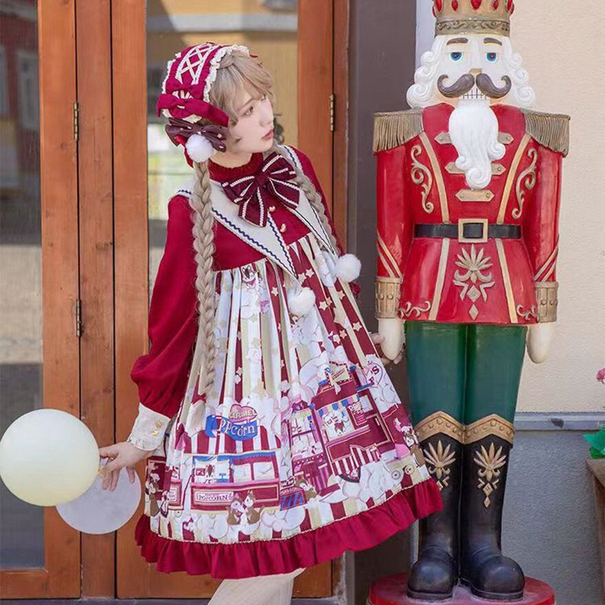 SEASONZ 甘ロリ ワンピース ドレス Aライン 長袖 レッド 赤 ポップコーン柄 ぽんぽん リボン くまちゃん ガーリー lolita