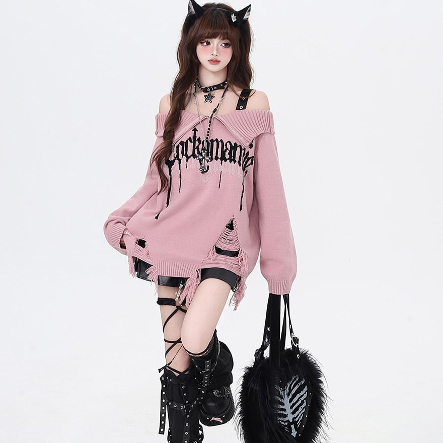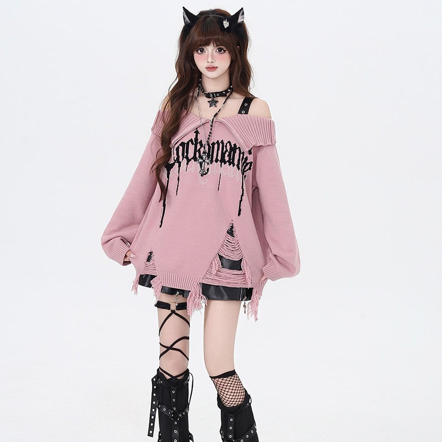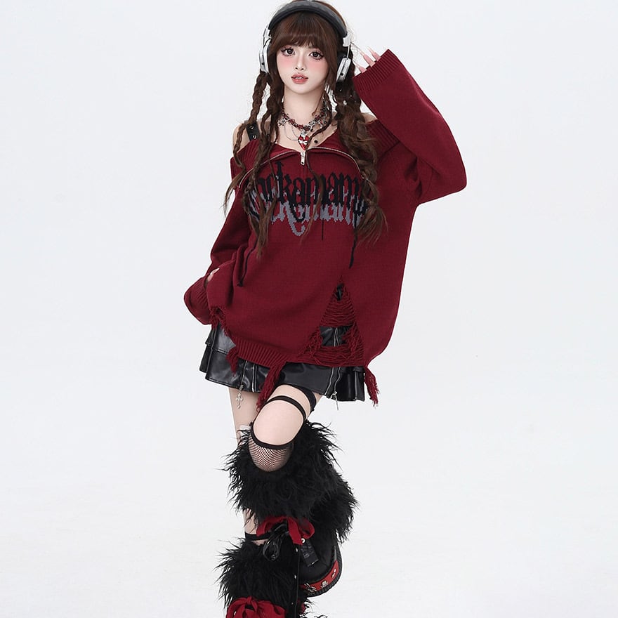 SEASONZ 地雷系 CRAZYGIRLシリーズ ニット セーター ZIP オフショルダー ダメージ加工 病み可愛い ダークファッション パンク ロリパン 地雷服 量産型