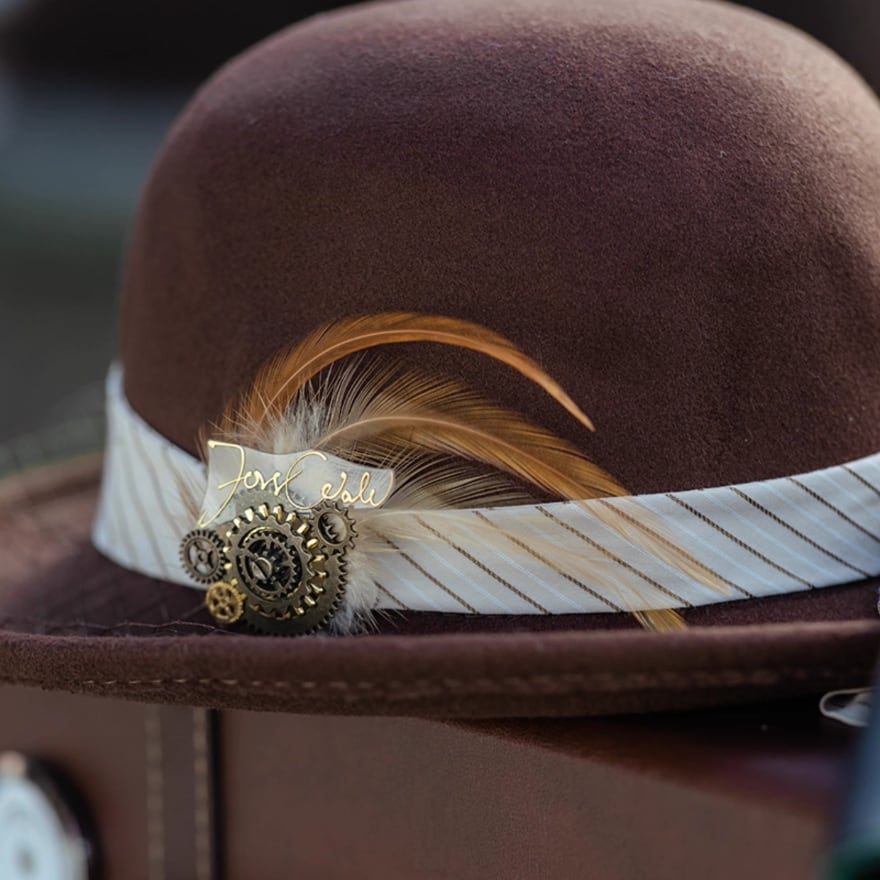 スチームパンクファッションらしい歯車に羽が特徴的な帽子です。