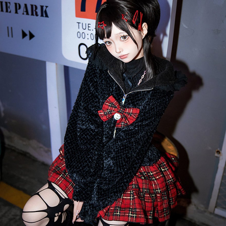 SEASONZ PUJIオリジナル ワンピース 猫耳フード ZIP チェック柄 リボン フーディ ゴシック 病み可愛い ロリィタ服