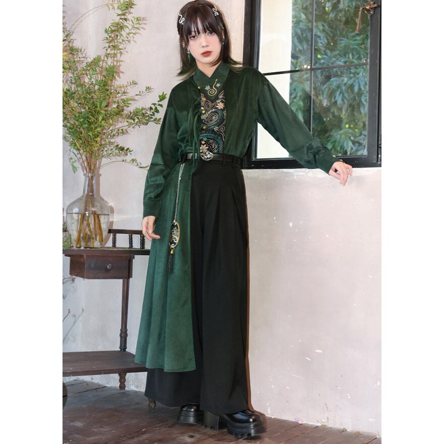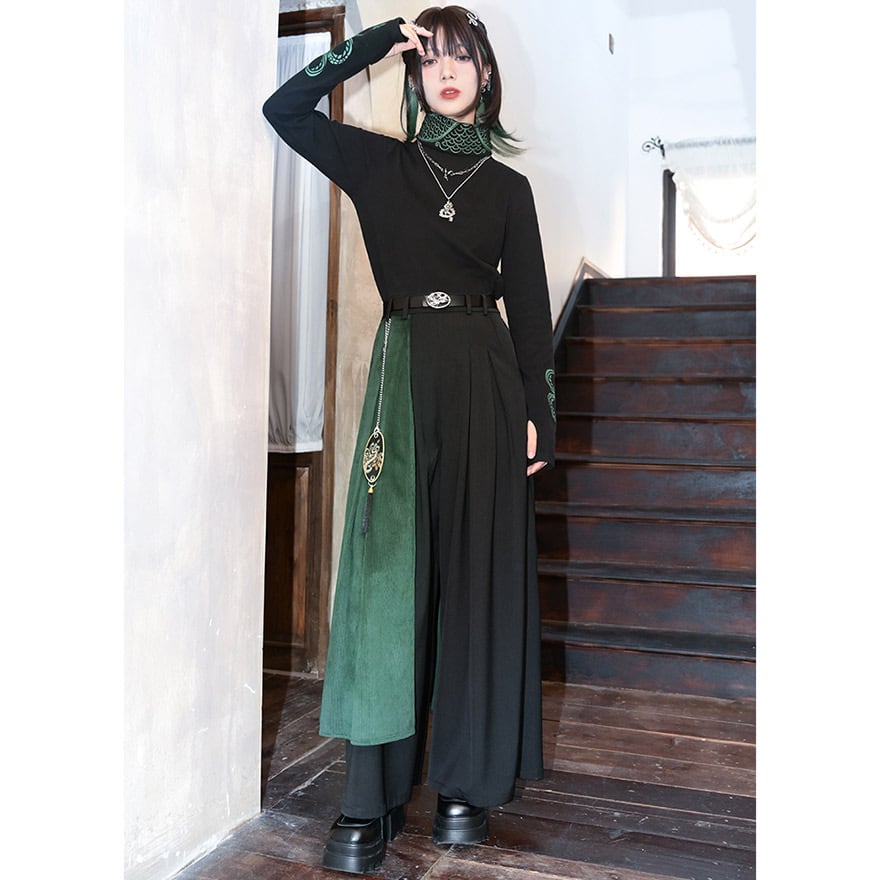 SEASONZ 古怪舎 チャイナ風 ワイドパンツ フレア 重ね着風 ツイード チェーン 袴パンツ レイヤード ハイウエスト 秋冬服 レトロ ゆったり とろみ感 大人ゴシック チャイナファッション