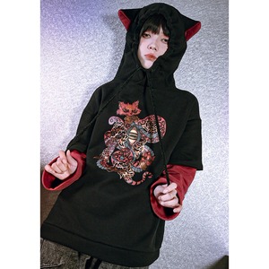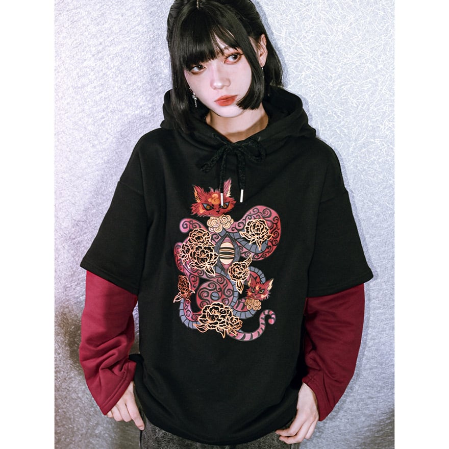 SEASONZ 古怪舎 チャイナ風 フェイクツーピースシャツ 重ね着風 プルオーバー スウェット フーディ パーカー 猫耳 秋冬服 アニメ風 プリント柄 レトロ 大人ゴシック チャイナファッション