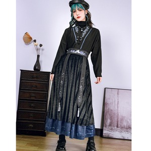 SEASONZ 古怪舎 チャイナ風 スカート ストライプ 重ね着風 花柄 鳥 レイヤード ロング丈 ハイウエスト タッセル 秋冬服 レトロ ゆったり とろみ感 大人ゴシック チャイナファッション