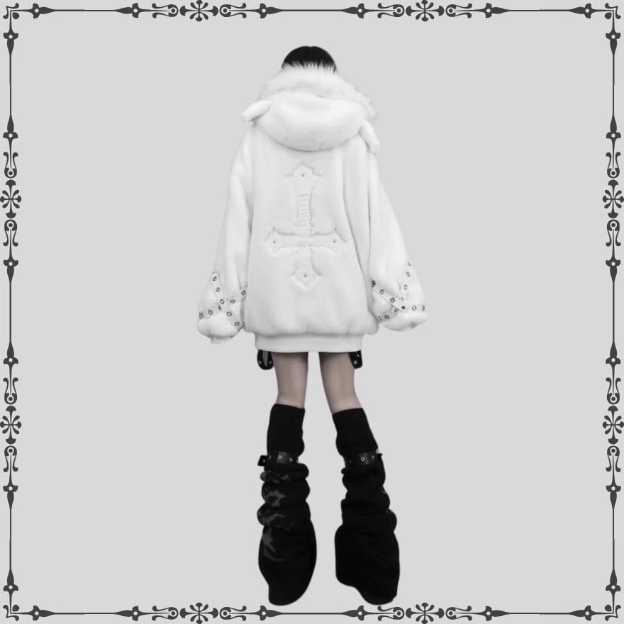 SEASONZ 地雷系 フーディ フェイクファー もふもふ 逆さ十字 病み可愛い ダークゴシック オーバーサイズ 原宿ファッション