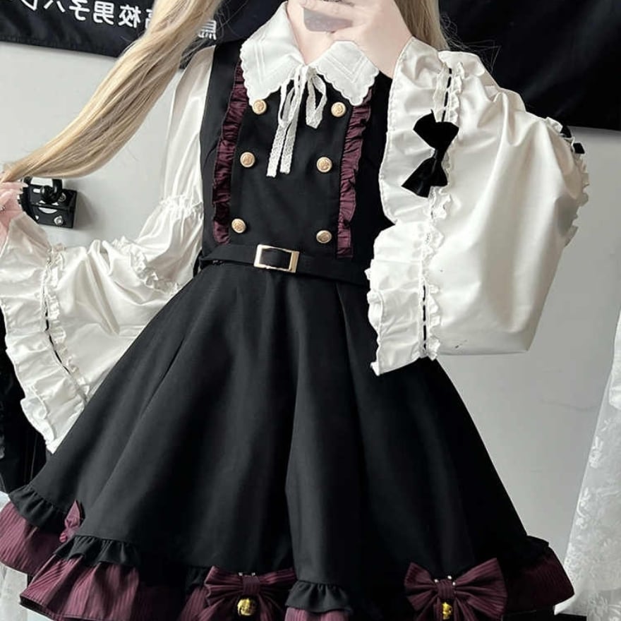 ワンポイントのリボンが可愛い姫袖にジャンパースカートのセットアップです。
