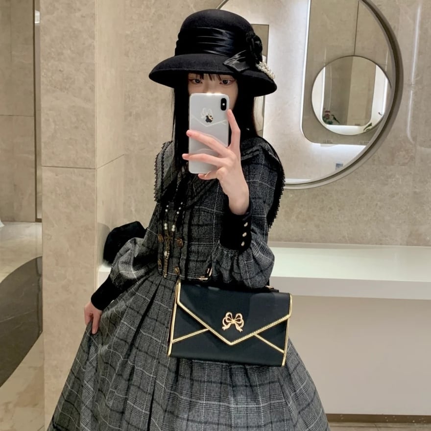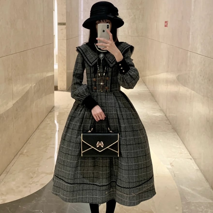 ハイウエストなふんわりシルエットが可愛いクラロリ系チェック柄ワンピースです。