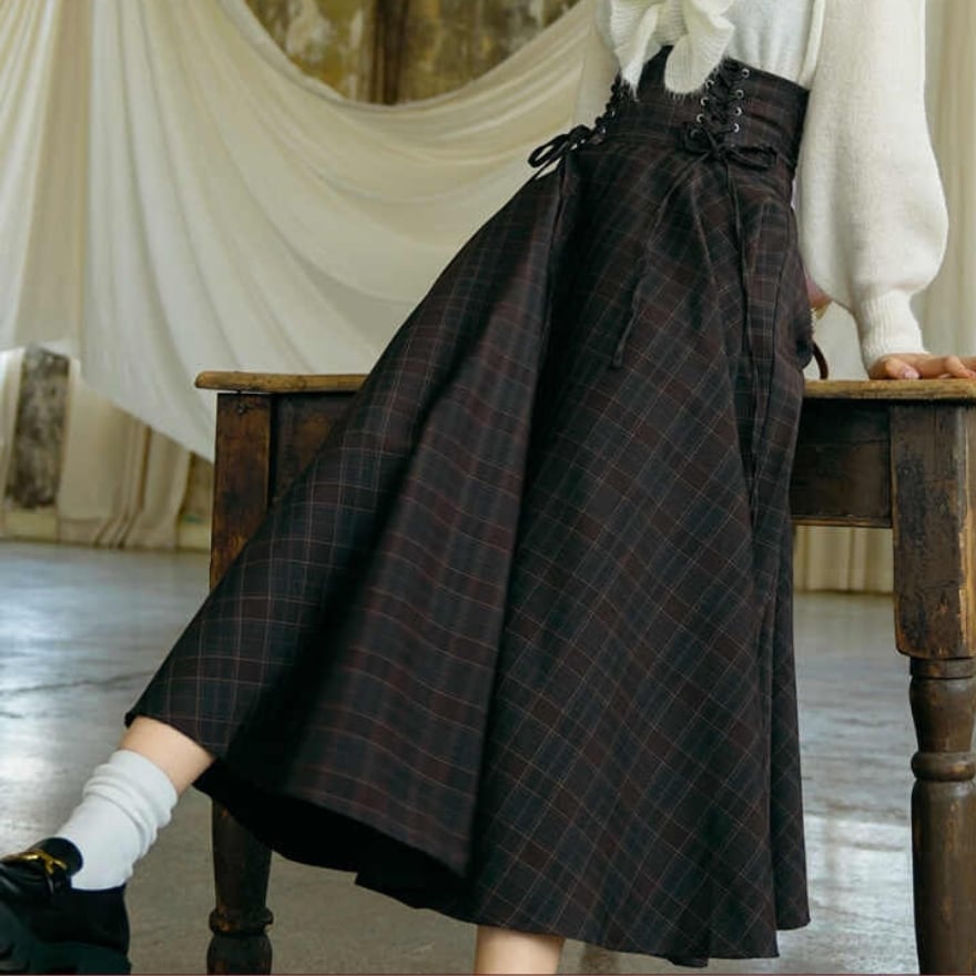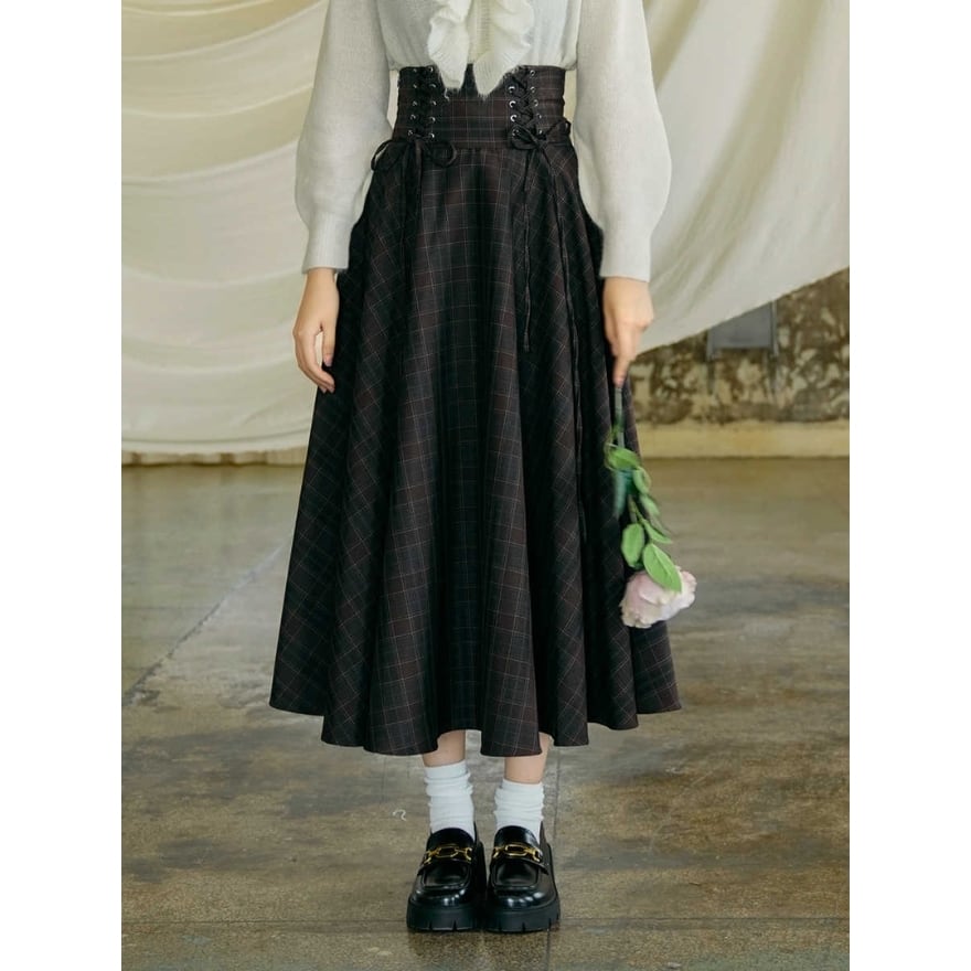 シックなチェック柄にレースアップのハイウエストクラロリスカートです。