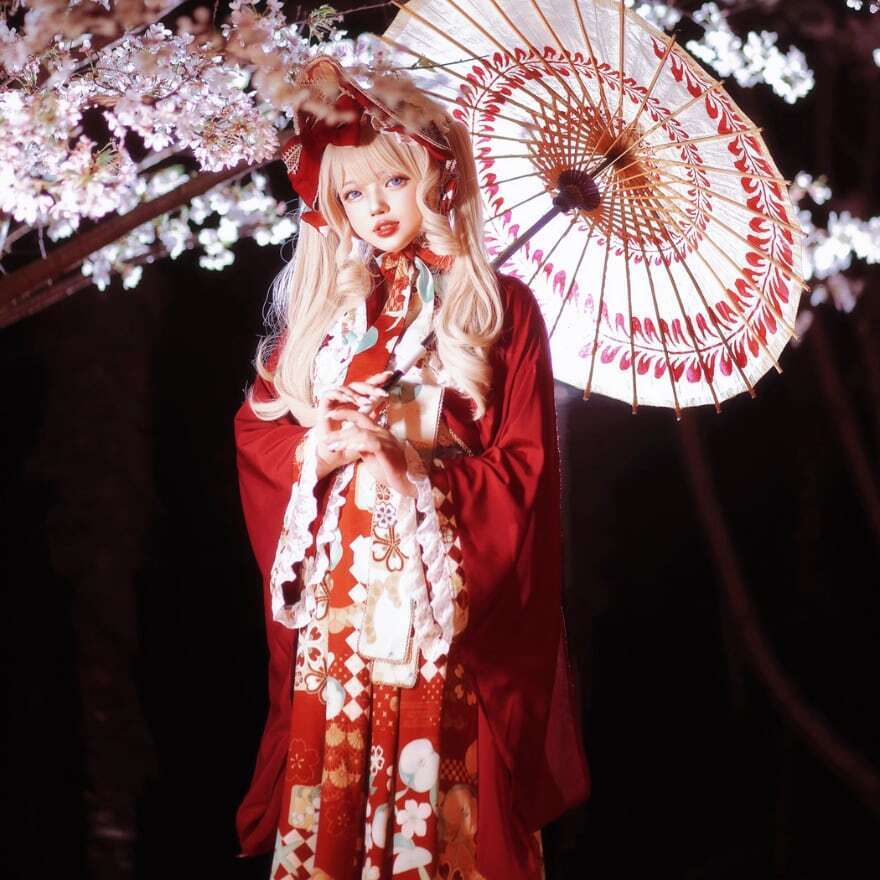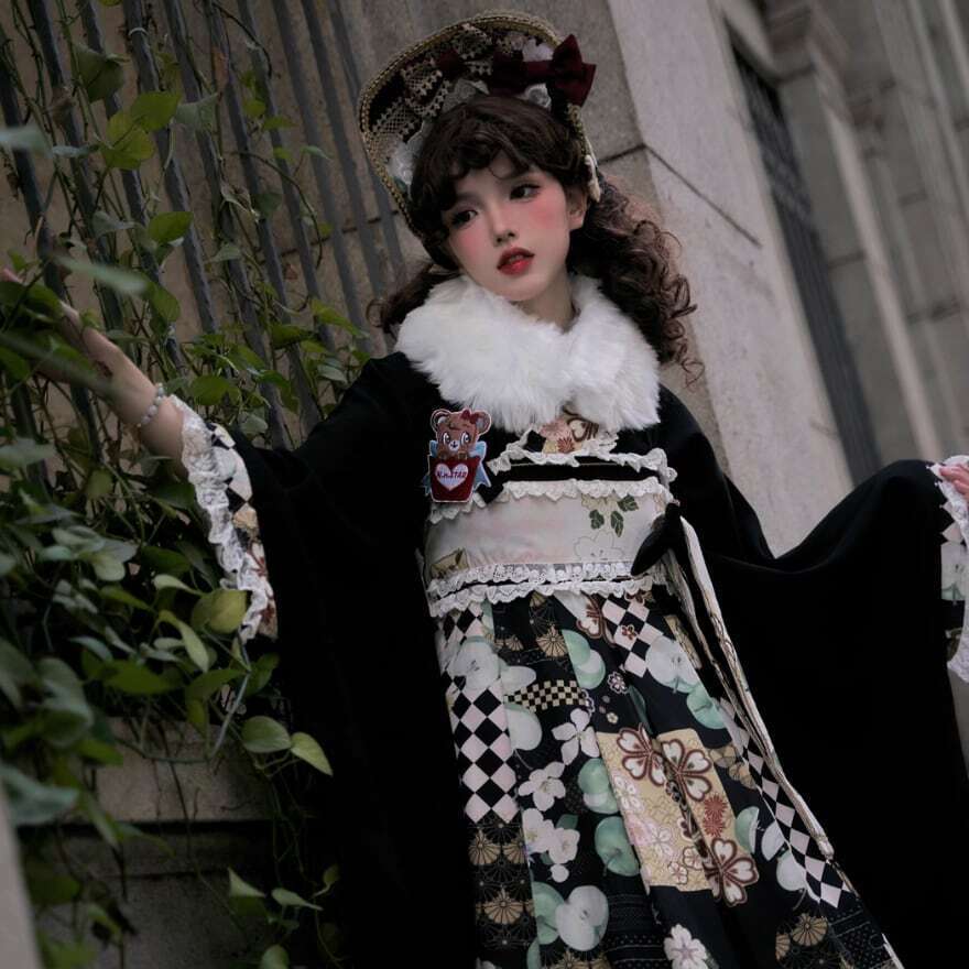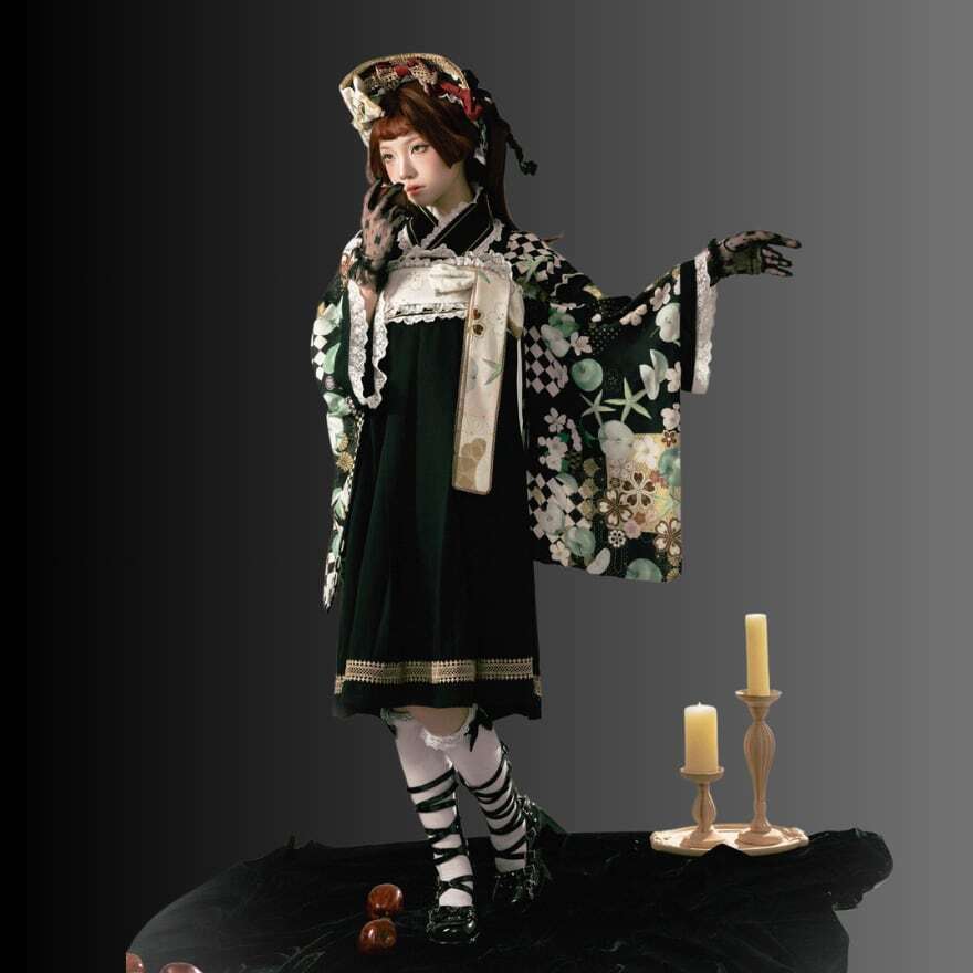 SEASONZ 国内発送 和風ロリータ 和装 和ロリ 着物 振袖 柄物 3点 フルセット ジャンパースカート リボン カチューシャ 花柄 ブラック 大正浪漫