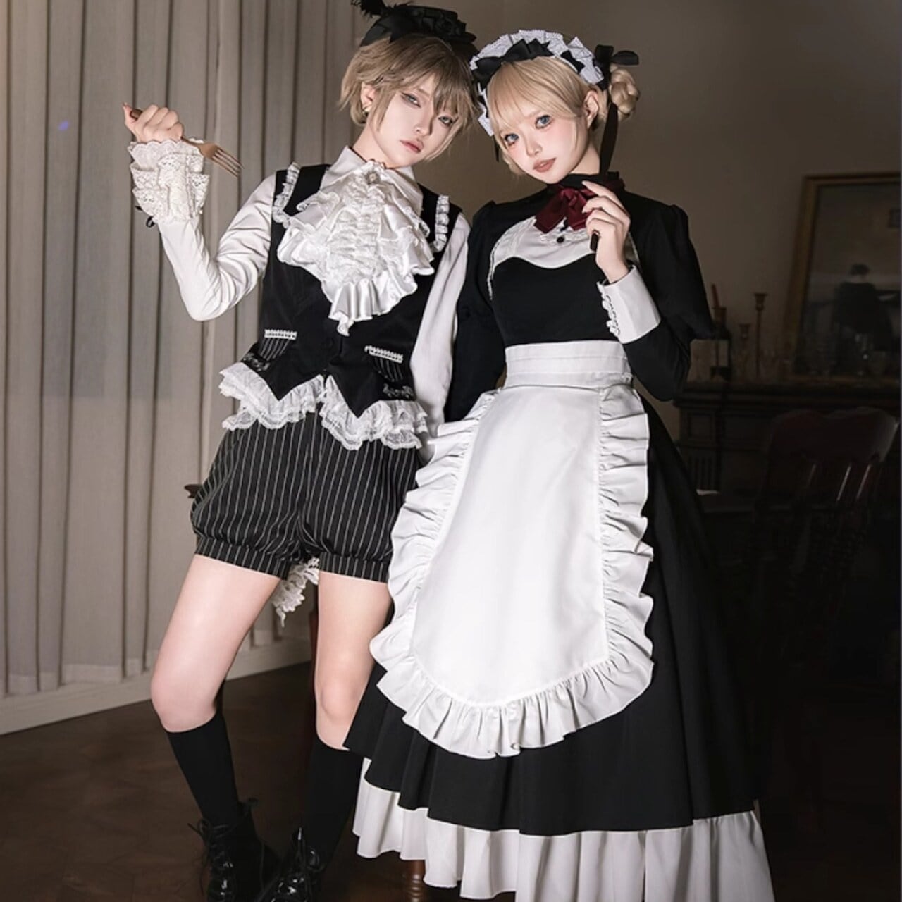 SEASONZ 国内発送 クラシカルメイド服 with PUJI 夜宴メイドワンピ 英国風 メイド服 ワンピース エプロン 双子コーデ 少年装 ゴシック 原宿スタイル ろりーた 控えめ