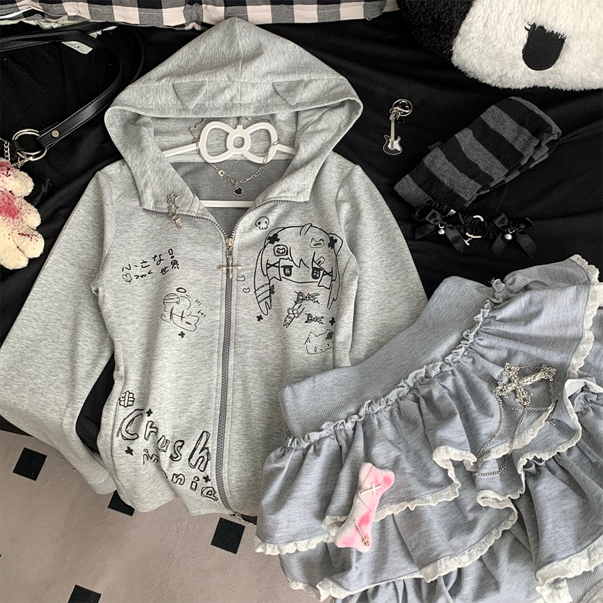SEASONZ 地雷系 地雷女子 パーカー 長袖シャツ 猫耳フード付き 羽織り 十字架 ZIP 秋冬服 量産型 イラスト 手書き風 原宿スタイル パンク ベビードール