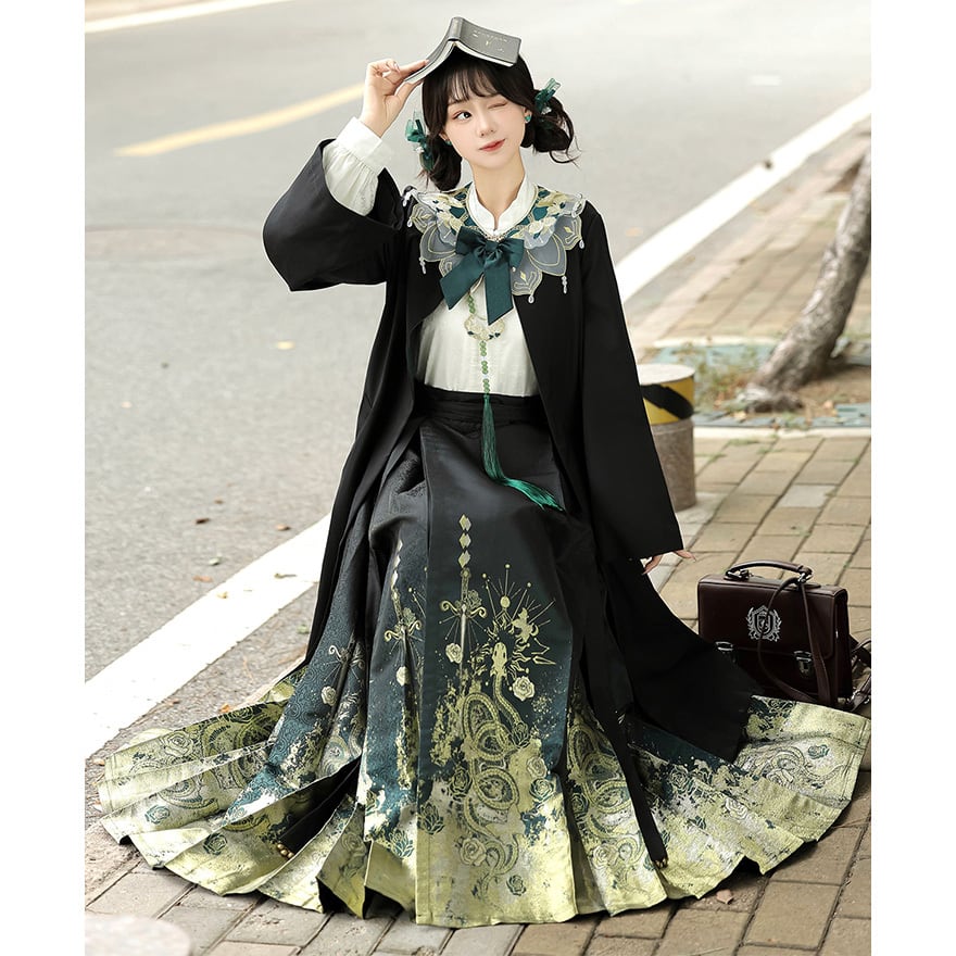 チャイナ風のトップスとスカート、マントの組み合わせが、麗しい異国情緒を醸し出すセットアップ。オリエンタルな雰囲気と、現代的なシルエットが融合した、個性的なアイテムです。