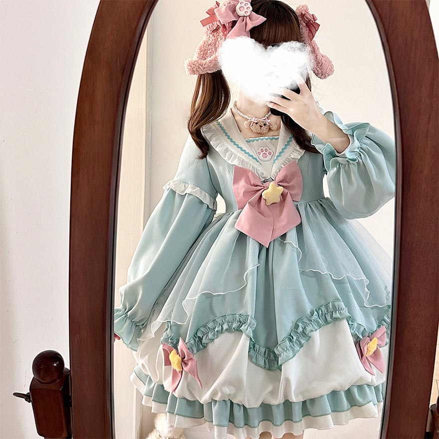 SEASONZ 甘ロリ 夢かわいい ワンピース 長袖 セーラー襟 リボン パステルカラー バックリボン ヘアアクセサリー付き ベビードール