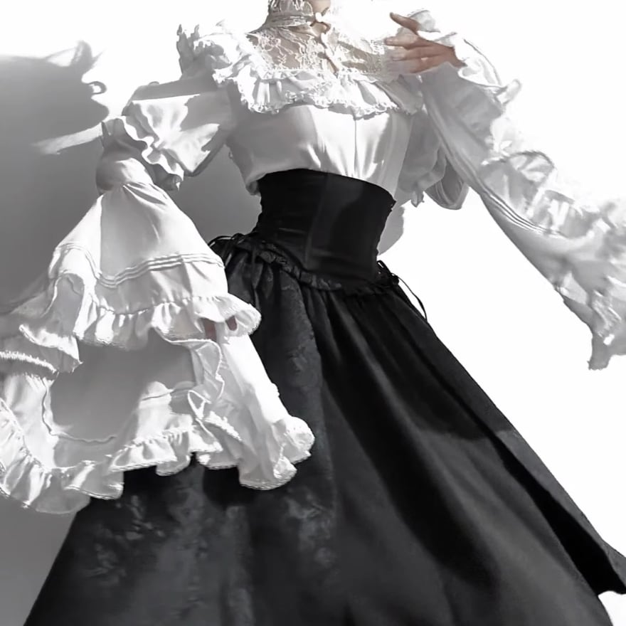 ゴスロリ 赤黒 ドレス セットアップ 修道女風 ハイウエスト ロングスカート ブラウス 姫袖 エレガント ステージ衣装 イベント衣装
