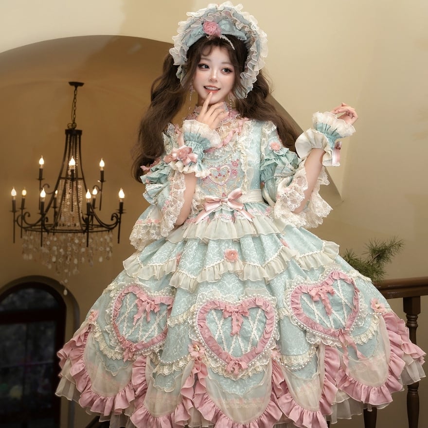 SEASONZ スイートロリィタ 甘ロリ 4点フルセット Princess ドレス ボンネット チョーカー 手袖 お嬢様ワンピース 豪華 エレガント 撮影会 イベント お茶会 衣装