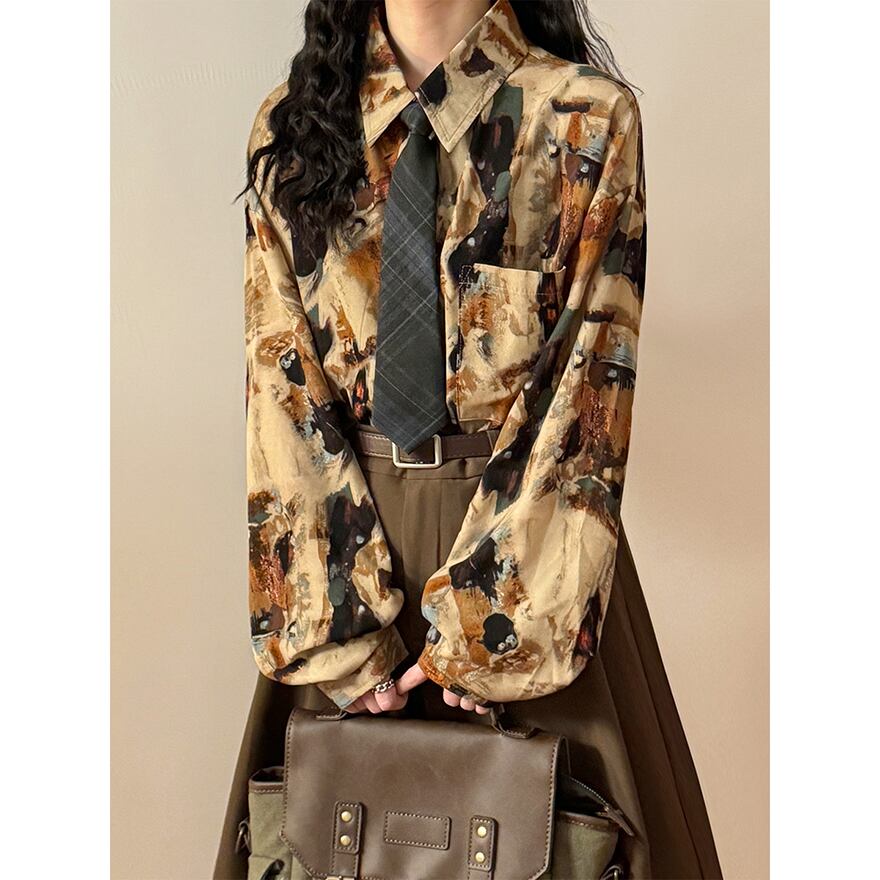 SEASONZ 油絵風 シャツ 油絵風プリント 総柄 バルーンスリーブ 長袖 レトロ ネクタイ付き プリントシャツ カジュアル 普段着