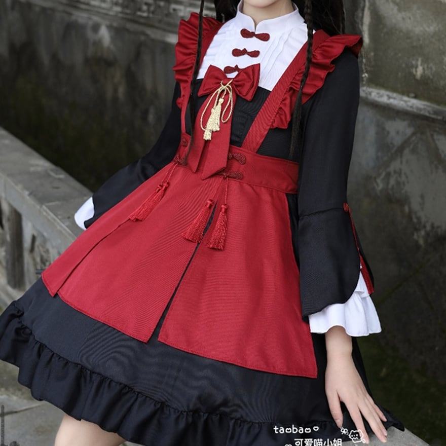 SEASONZ チャイナ風 メイド服 中華ロリータ ワンピース 長袖 メイド服 セット カチューシャ タッセル 中華風メイド コンカフェ メイドカフェ イベント衣装